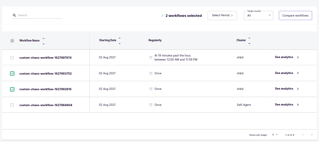 For comparing the chaos scenarios, you can select the scenarios from the table & click on Compare Chaos Scenario button.